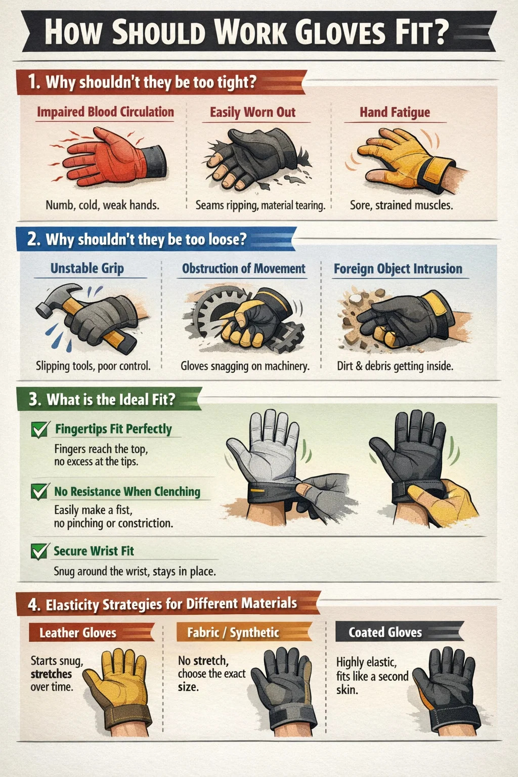 যদিও সবাই নমনীয়তা চায়, নির্বাচন করা কাজের গ্লাভস যেগুলি খুব টাইট হলে নিম্নলিখিত সমস্যা হতে পারে: