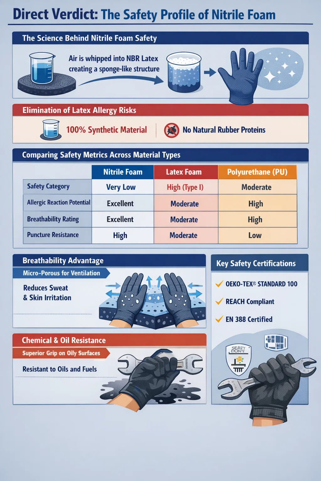 সরাসরি প্রশ্নের উত্তর দিতে: হ্যাঁ, নাইট্রিল ফোম ব্যতিক্রমী নিরাপদ বেশিরভাগ মানুষের জন্য এবং প্রায়শই সংবেদনশীল ত্বকের জন্য এটি পছন্দের পছন্দ। যেহেতু এটি একটি 100% সিন্থেটিক উপাদান, এতে প্রাকৃতিক রাবার প্রোটিন নেই যা ল্যাটেক্স এলার্জি সৃষ্টি করে। উপরন্তু, নাইট্রিল ফেনা একবার নিরাময় হয়ে গেলে রাসায়নিকভাবে নিষ্ক্রিয় হয়, মানে এটি স্ট্যান্ডার্ড ব্যবহারের সময় বিষাক্ত ধোঁয়া বা ক্ষতিকারক অবশিষ্টাংশ মুক্ত করে না, এটি প্রতিরক্ষামূলক গিয়ারের জন্য একটি শিল্পের মান তৈরি করে।
