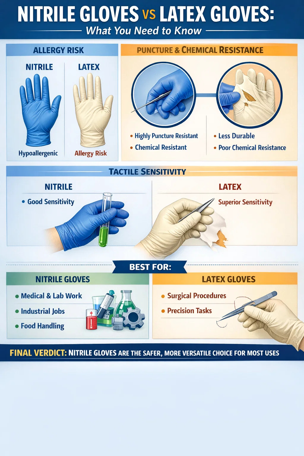 যখন নাইট্রিল গ্লাভস এবং ল্যাটেক্স গ্লাভসের মধ্যে নির্বাচন করার কথা আসে, নাইট্রিল গ্লাভস বেশিরভাগ ব্যবহারকারীর জন্য নিরাপদ বিকল্প হিসাবে বিবেচিত হয় - বিশেষ করে চিকিৎসা, শিল্প এবং খাদ্য-হ্যান্ডলিং পরিবেশে। প্রাথমিক কারণটি সোজা: ল্যাটেক্স গ্লাভসে প্রাকৃতিক রাবার প্রোটিন থাকে যা হালকা ত্বকের জ্বালা থেকে শুরু করে জীবন-হুমকি অ্যানাফিল্যাক্সিস পর্যন্ত অ্যালার্জির প্রতিক্রিয়া সৃষ্টি করতে পারে। নাইট্রিল গ্লাভস, একটি সিন্থেটিক রাবার যৌগ থেকে তৈরি, এই ধরনের অ্যালার্জির ঝুঁকি বহন করে না।