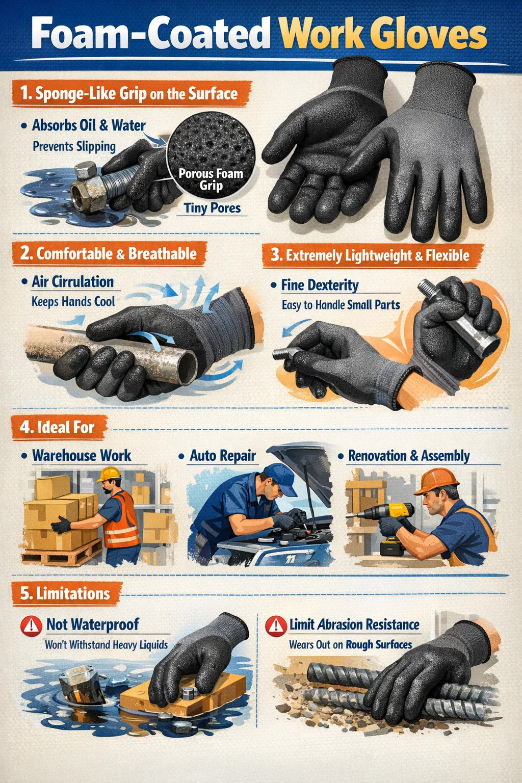 সীমিত ঘর্ষণ প্রতিরোধের: মোটা চামড়ার কাজের গ্লাভসের তুলনায়, বিশেষ করে রুক্ষ রেবার বা পাথরের সাথে কাজ করার সময় ফোমের আবরণ দ্রুত ফুরিয়ে যায়।