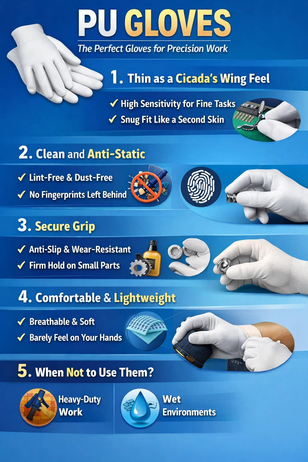 এই গ্লাভসগুলি বিশেষত নির্ভুল ইলেকট্রনিক্স, পরীক্ষাগারে বা সংস্কারে বিশদ কাজের জন্য সাধারণ। এখানে তাদের কিছু বৈশিষ্ট্য রয়েছে: