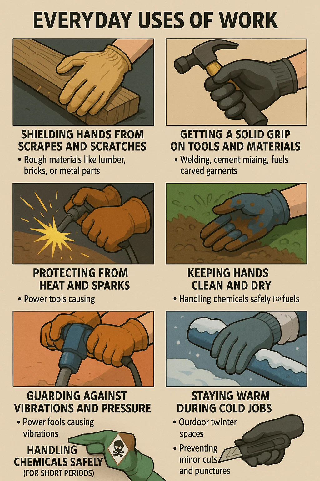 কাঠ, ইট, কংক্রিট ব্লক বা ধাতব অংশগুলির মতো রুক্ষ উপকরণগুলি পরিচালনা করার সময়, কাজের গ্লাভসগুলি বর্মের মতো কাজ করে। তারা স্প্লিন্টার, তীক্ষ্ণ প্রান্ত এবং ঘষিয়া তুলিয়া ফেলিতে সক্ষম পৃষ্ঠগুলিকে আপনার ত্বকে আঘাত করা বন্ধ করে।