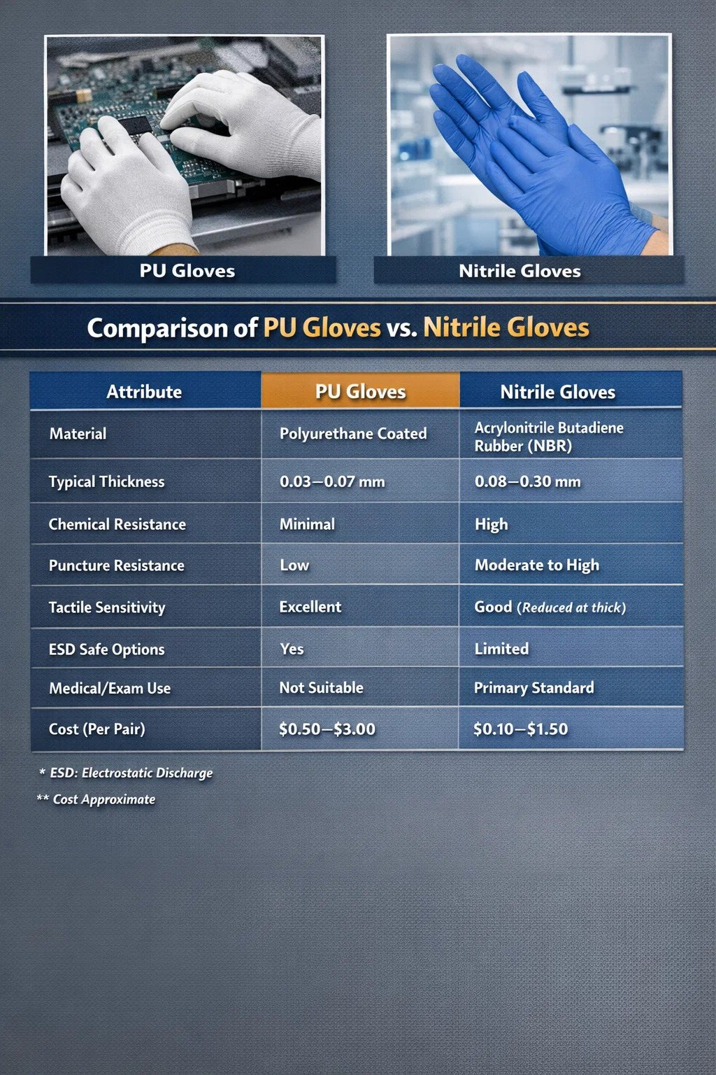 PU (পলিউরেথেন) গ্লাভস এবং নাইট্রিল গ্লাভস বিনিময়যোগ্য নয়। PU গ্লাভস পাতলা, হালকা ওজনের, এবং প্রাথমিকভাবে পরিচ্ছন্ন ঘরের পরিবেশ এবং ইলেকট্রনিক্স হ্যান্ডলিংয়ের জন্য ডিজাইন করা হয়েছে, যখন নাইট্রিল গ্লাভস চিকিৎসা, পরীক্ষাগার এবং শিল্প ব্যবহারের জন্য উপযুক্ত শক্তিশালী রাসায়নিক প্রতিরোধ এবং পাংচার সুরক্ষা প্রদান করে। ভুল টাইপ বেছে নেওয়া শুধু দক্ষতা কমায় না-এটি শ্রমিকদের প্রকৃত বিপদ বা সংবেদনশীল উপাদান দূষিত করতে পারে।