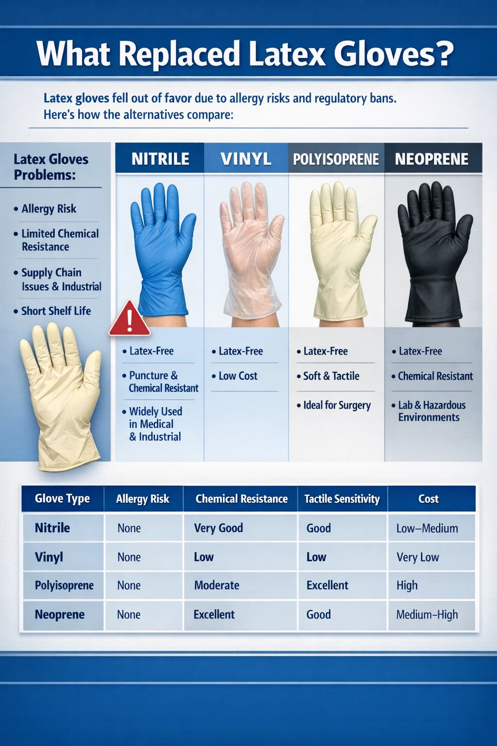 আপনি যদি একটি সরাসরি উত্তর খুঁজছেন, নাইট্রিল গ্লাভস আজ বেশিরভাগ শিল্প জুড়ে ল্যাটেক্স গ্লাভসের জন্য প্রভাবশালী প্রতিস্থাপন। হাসপাতাল, ডেন্টাল ক্লিনিক, ফুড প্রসেসিং প্ল্যান্ট বা স্বয়ংচালিত কর্মশালায় যাই হোক না কেন, নাইট্রিল পছন্দের দস্তানা উপাদান হিসাবে ল্যাটেক্সকে ছাড়িয়ে গেছে। এই পরিবর্তনটি 1990 এর দশকে ত্বরান্বিত হতে শুরু করে যখন স্বাস্থ্যসেবা কর্মীদের মধ্যে ল্যাটেক্স অ্যালার্জির হার উদ্বেগজনক পর্যায়ে উঠেছিল - কিছু গবেষণায় দেখা গেছে যে সংবেদনশীলতার হার যত বেশি নিয়মিত উন্মুক্ত চিকিৎসা পেশাদারদের মধ্যে 17% . তারপর থেকে, নির্মাতারা, নিয়ন্ত্রক এবং সংগ্রহকারী দলগুলি ক্রমবর্ধমানভাবে ল্যাটেক্স-মুক্ত বিকল্পগুলির পক্ষে।