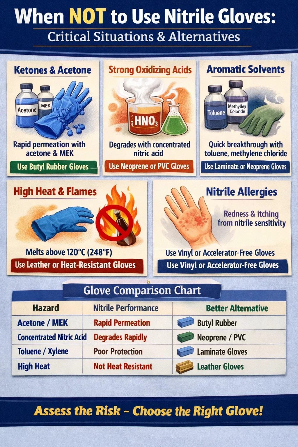 The short answer: avoid nitrile gloves when handling certain ketones, strong oxidizing acids, or highly concentrated solvents; when working with extreme heat or open flames; when fine tactile dexterity is critical and the task duration is short; or when the person wearing them has a documented nitrile sensitivity. Read on for the full breakdown.