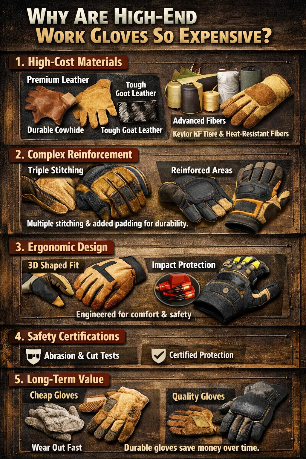 কয়েক ডলার দামের এক জোড়া সস্তা গ্লাভস মাত্র একদিনের কাজ করার পরে একটি গর্ত পেতে পারে, যা আপনাকে ক্রমাগত প্রতিস্থাপন কিনতে বাধ্য করে। যাইহোক, একজোড়া উচ্চ-মানের কাজের গ্লাভস যা ছয় মাস ধরে স্থায়ী হয় তার দাম কম হতে পারে প্রতিদিনের তুলনায় কম। স্থায়িত্ব থেকে প্রাপ্ত এই দীর্ঘমেয়াদী মূল্য প্রিমিয়াম মূল্যের আরেকটি কারণ।